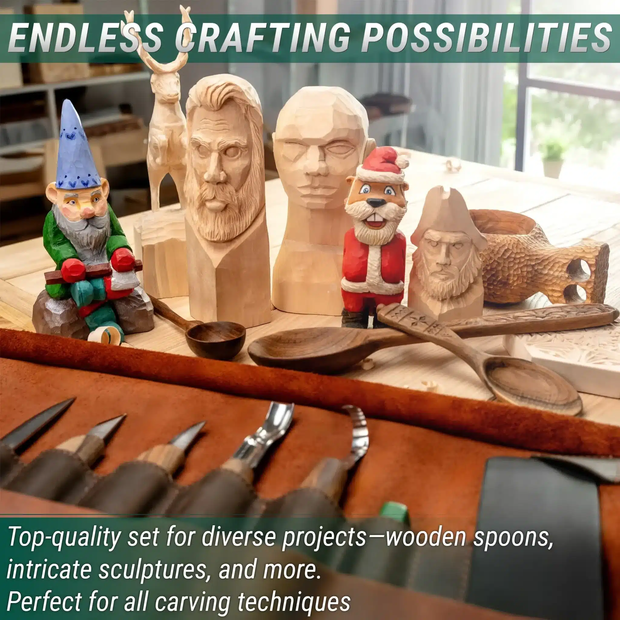 Deze deluxe set maakt het mogelijk om diverse projecten te realiseren: van lepels en kleine figuren tot complexe ornamenten en decoratieve sculpturen. De set wordt geleverd in een stijlvolle leren gereedschapsrol voor veilige opslag en transport.
